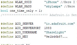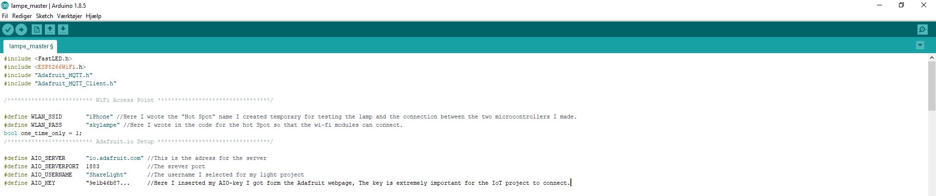 In the line where I define WLAN_SSID I wrote in the name of my temporary "Hot Spot": "iPhone" (see the above picture) for testing the lamp and the connection between the two microcontrollers I made. In the next line of my "masterlamp code" define WLAN_PASS, I wrote in the password for the Hot Spot so that the wi-fi modules could connect to the internet. In this case the password was "skylampe".