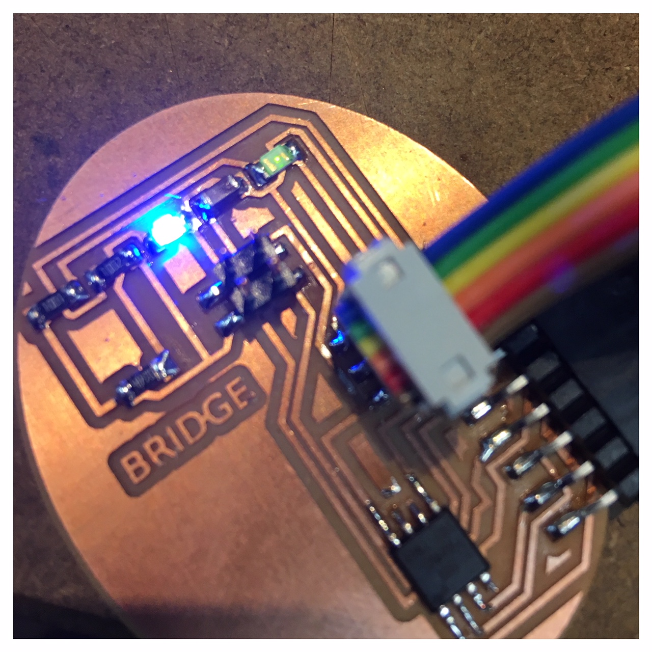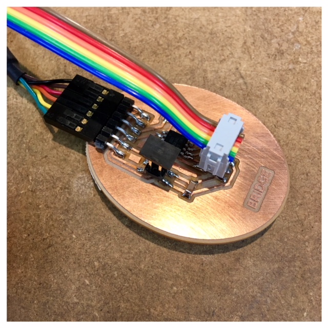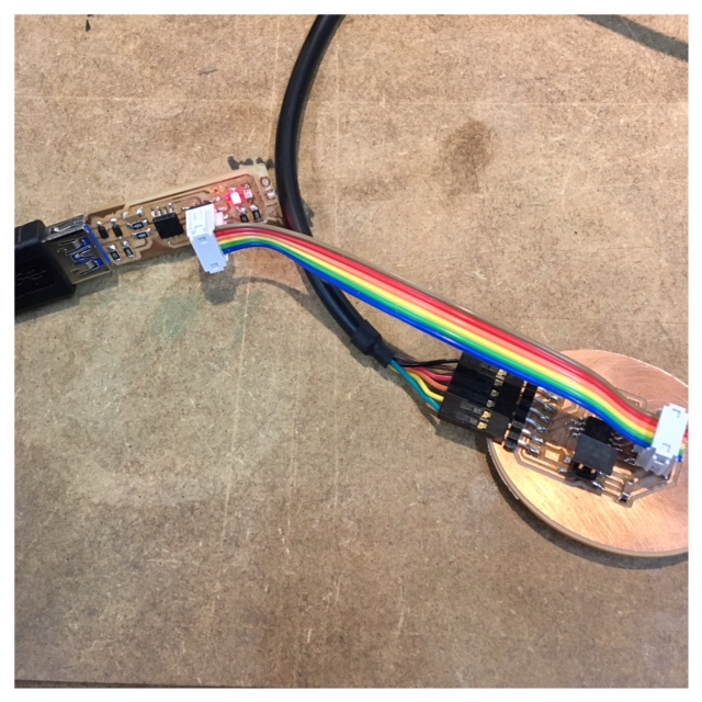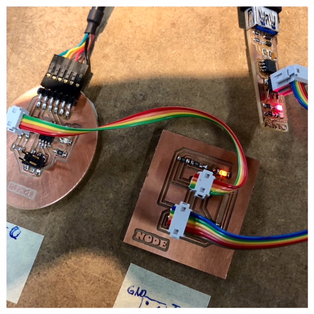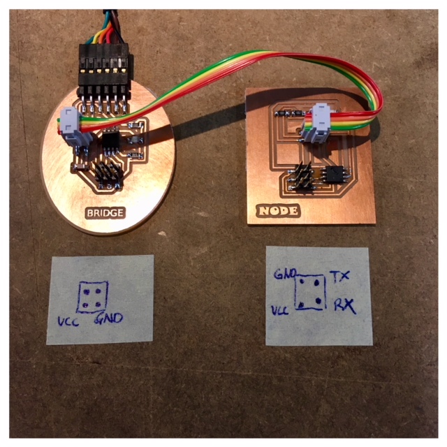 For this week's assignment, I decided to make a bridge board and a node board with an ATTiny45 to communicate by a wired network. As an entry for this assignment I referred to Neil's board and added a LED and a resistor. For designing the PCB, I followed the same procedure that I did in the past weeks using eagle and Fabmodules together with the Roland mill. The schematic and the board layout for the bridge- and note board are included at the top of the site under files.
