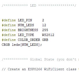 To give an example from the code about this brightness level please see the above pictures. First I define the LED's I am using. The communication from the microcontroller to the LED's goes from the digital port LED_PIN 2. In the second line I define the number of LED's I work with (In this case 12). Then I define the brightness level to 255 (Witch is a bright amount of light).