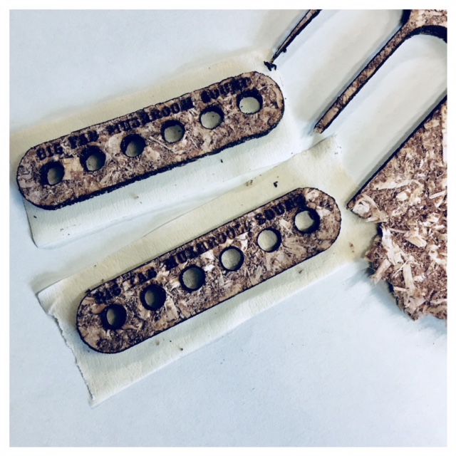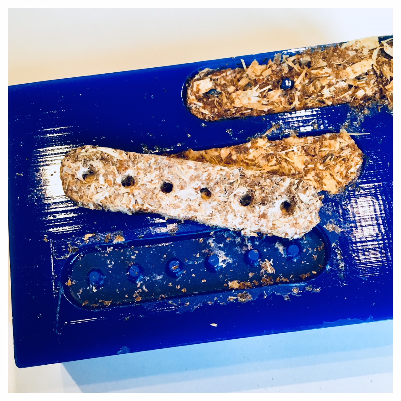 The pickup frame that came from the mold did not apear as nice as the one that was the laser cut from a mycelium plate. I think that the mycelium mass in the mold would have been really goodt if the mass had been finer when molding such a small object. The struture was nice and really very strong which surprised me.
