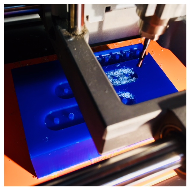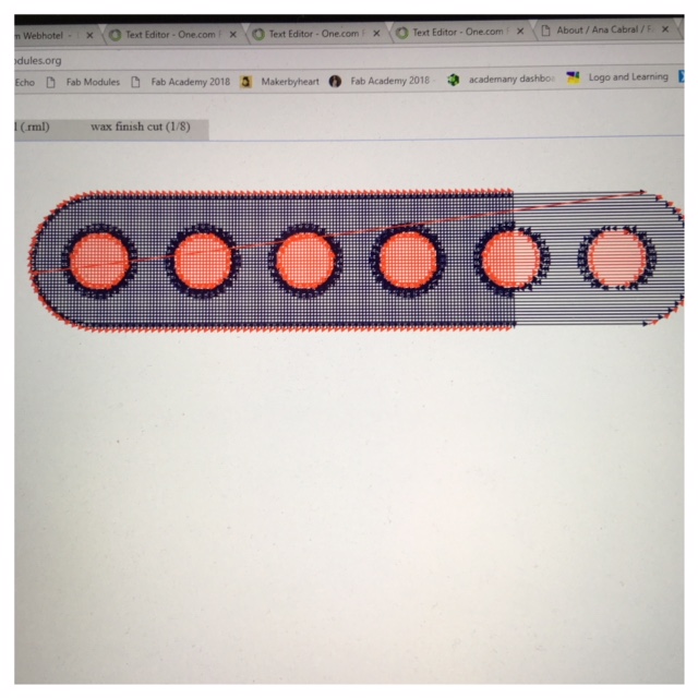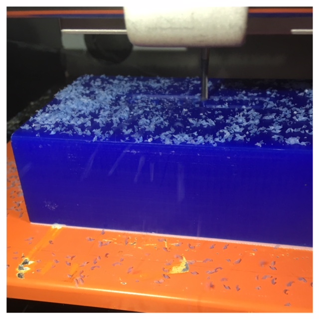 The mold I created in Fusion 360 (to grow to mycelium in) I have milled on the Roland CNC in blue machinable wax. I created the mesh (.stl) and the two pathes in Fabmodules. One "wax rough cut (1/8)" and the other a "wax finish cut (1/8)" using a flat head CNC cutting tool for the rough path and a ball head for the finish cut.