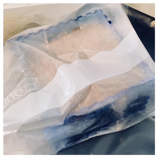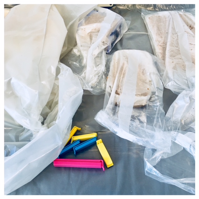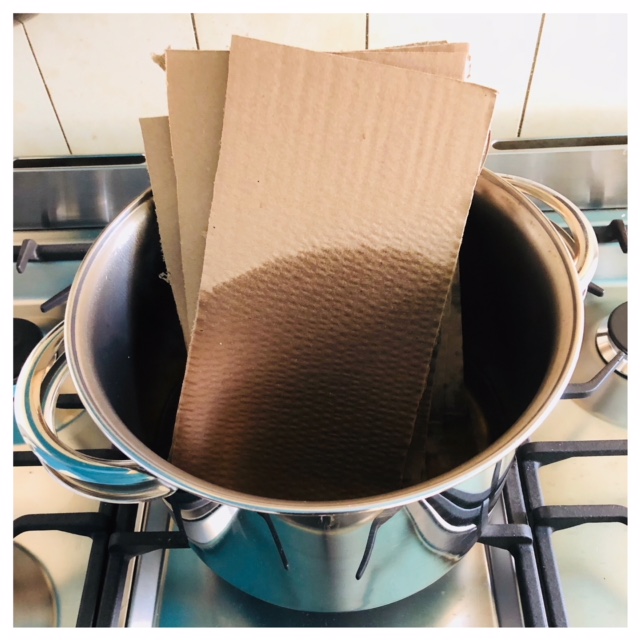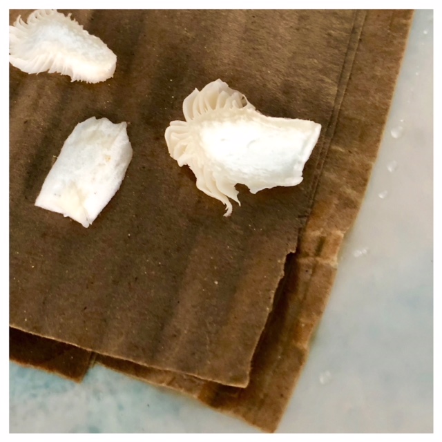 To prepare the growing environment I cut the cardboard into pieces that fit well into the sterile bag (Here I used freezer bags designed for food). Stack them up and cook the carboard for 10-15 minutes. You may need to weigh them down so that they are fully immersed under the water. When I took the cardboard up it had to cool down and dry somewhat, and after a while I could easily separate the sheets and make my sandwich of cooked cardboard and the thin base cuts of the oyster mushrooms.