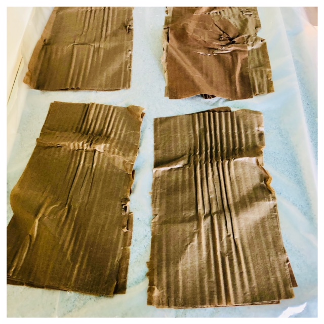 Add a layer of cardboard to the bottom of the bag. As you form the layers you need to have a corrugated sheet and a flat sheet. The corrugated layer gives the mycelium space to grow into. Alternatively you can use corrugated sheets for all layers. Spread the little pieces of mushroom evenly and fairly close together and cover with a sheet of cardboard. Repeat until you have filled the container and the layers are filled with mushroom (And remember to use the top of the Oyster mushroom for your evening dinner, they are delightful).