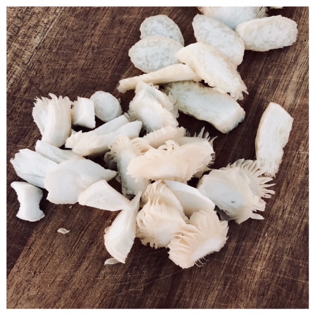 After a thorough search on the web on everything from "How to grow mycelium" to "Biodegradable plastics", I found out that the mushroom that is "easiest" to grow is the oyster mushroom. I bought a package at the market and chose a package where the bases of the mushroom was fairly long on each of the them because you only use the base as this is the reproduction part which will grow within the cooked cardboard. I used a really sharp knife to cut tiny slices of the base and inserting them in the carboard layers.