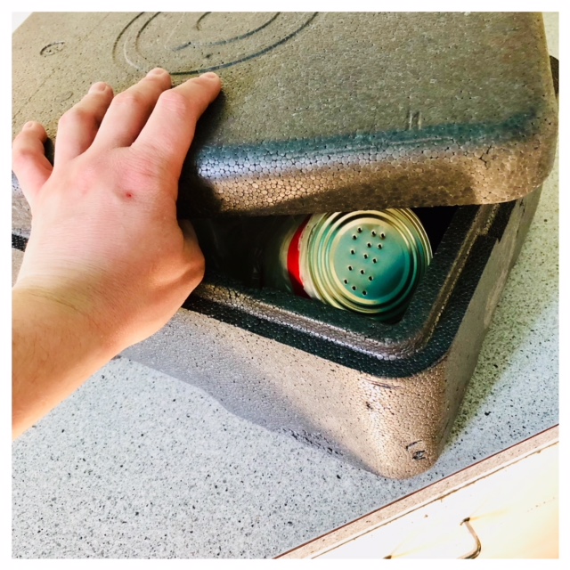 Now I have my growing environment for the mycelium ready and wrapped up. I stored it in a dark place at room temperature (but still a bit chilly like 16 degrees C). Every day I opened the box to let some air in and out. Without any air exchange the carbon dioxide level builds up and your mycelium will have stunted growth. I made a kind of humidore (constructed like the ones you are storing cigars in) by using a old coolbox where I put a container with a cloth I could keep wet to achieve a constant moisture in the box and at the same time make sure that the mushrooms were in a dark place.