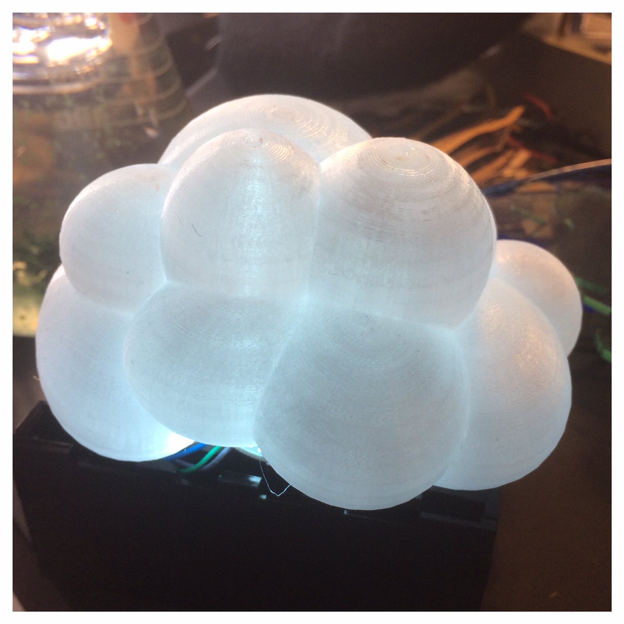 For slicing my cloud and preparring my file for the 3D-printer I used a software called Simplify3D simplify3d I worked with a layer hight on 0.2 and a 0.4 nozzle, the infill was 100 % (and quite hard getting out of the cloud, because of the small hole and all the curves). I set the support structures to support everything that slopes under 45 degrees, and it was only under the buttom of the cloud. It still needed support under the cloud because I made the button uneven, to make it look more realistic and create some nice light shapes underneath.