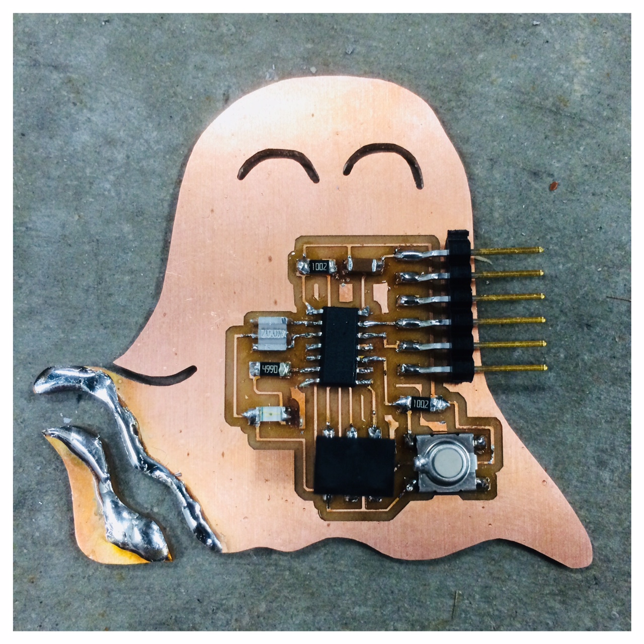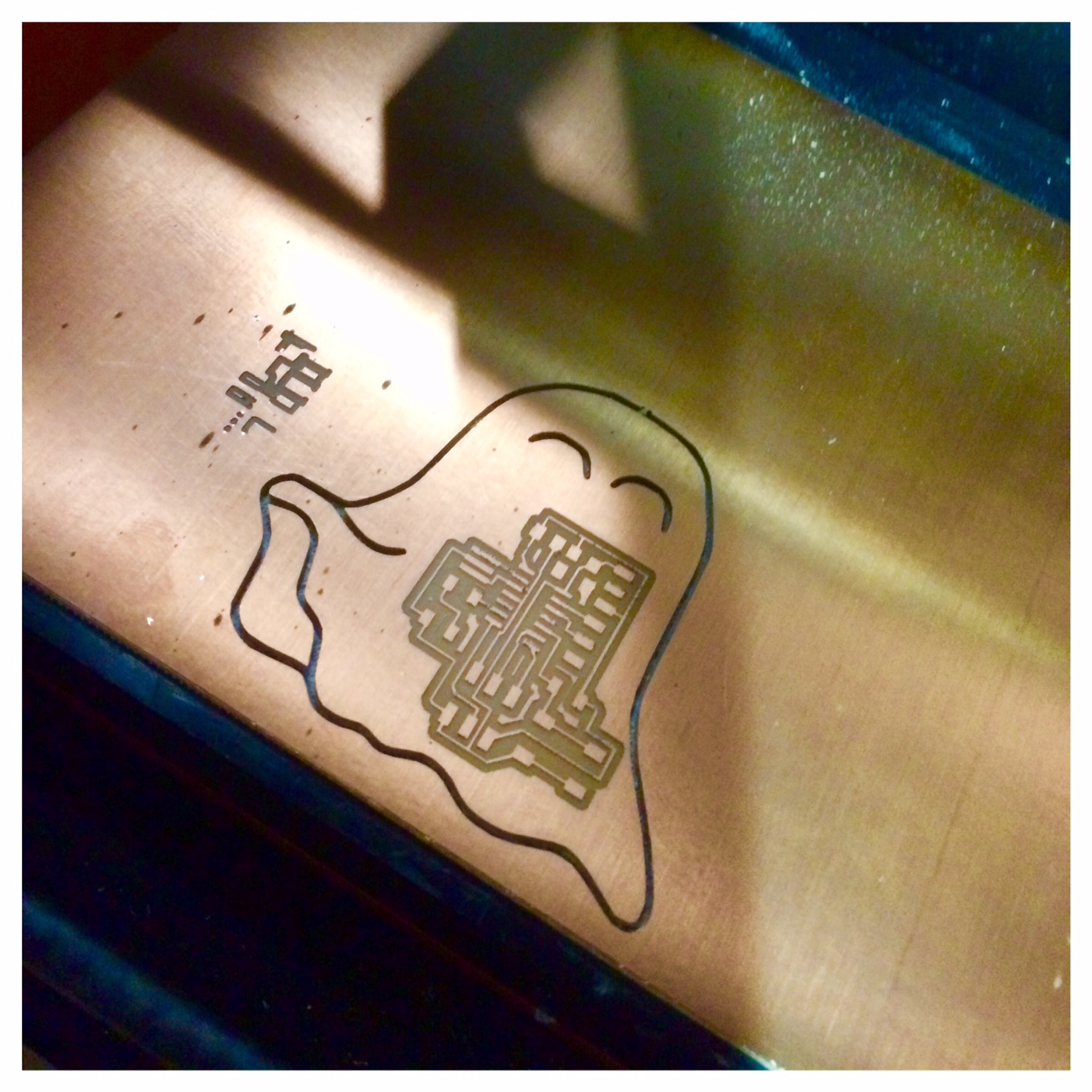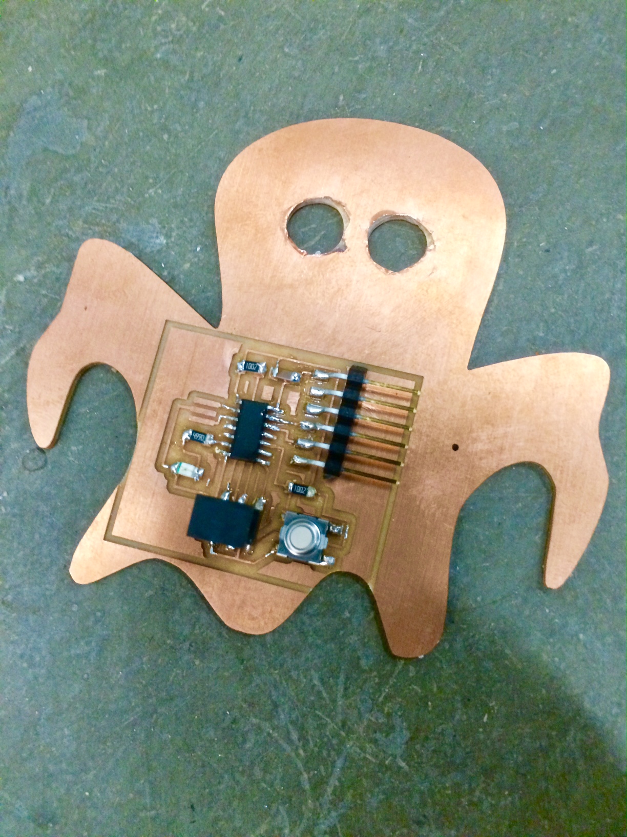 I cut the traces including a frame that made the ghost look a bit ugly, with the line goes beyond the actual cut-out. Not that it broke the circuit itself, but it did not look nice. The first ghost I had drawn was also quite large in order to contain the traces.