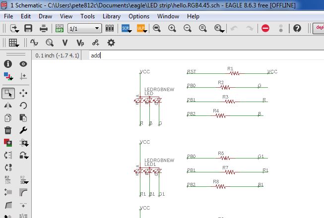 I started this week out with installing Eagle and imported a parts library from the FabAcademy schedule page for this week fab.lbr I started schematic design (.sch) with EAGLE and added following components: