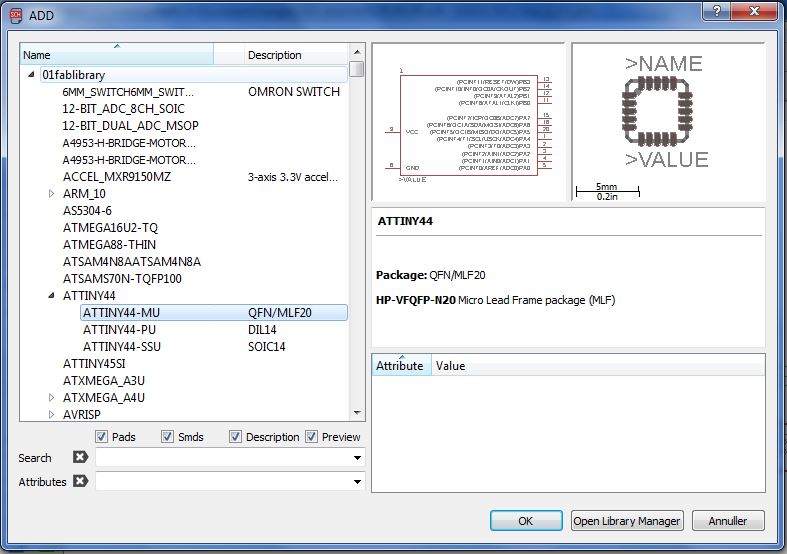 After adding the fab.libraries (file attached in the top of the page) I could easy add the components for the Fablab-inventory list into my Eagle schematics and boards. I used the following steps. Write add and press enter in the shearch bar and click on the fab.lib-folder, then choose which component you want to import and click OK. See the steps in the pictures below.