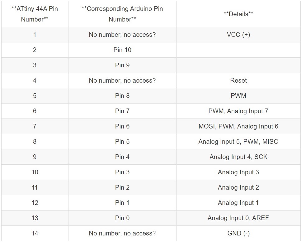 The pin numbers I would have to program in a software on a computer is not the same as the number of the microcontroller on the actual board. This is because some of the numbers are used for other things than programmable pins. In the tutorials section of the Fab Academy website there is a good schematic showing the pins of the ATtiny44 microcontroller and its correspondent pin in the Arduino software. Looking at page 2 and 3 in the data sheet we see the reason why the pin numbers are different. Pin number 1, 4 and 14 are used for VCC, GND and reset which is why they are not programmable pins and therefore not usable in the Arduino software.