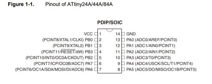 Before I started to program the board I needed some knowledge of the components and microprocessor we are using and its specifications. For doing so I read its datasheet, in my case the one of the ATtiny44 trying to extract the main information of it. An important thing is to know wich pins you have in your microcontroller and where you have connected to the components that you work with. In my attempt to getting to know the possibilities of the microcontroller and the ATtiny44 I had to understand how the pins of the microcontroller were laid out so that I would be able to program them.