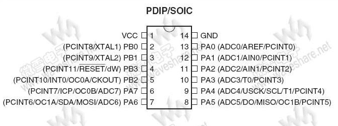 Another important thing is to read the datasheet. On my board I chose PB3 as the analog in pin to read the data. From the data sheet we can know that PB3 pin can read analog signal and it can be used as input pin. In fact, it could also be used as an output pin.