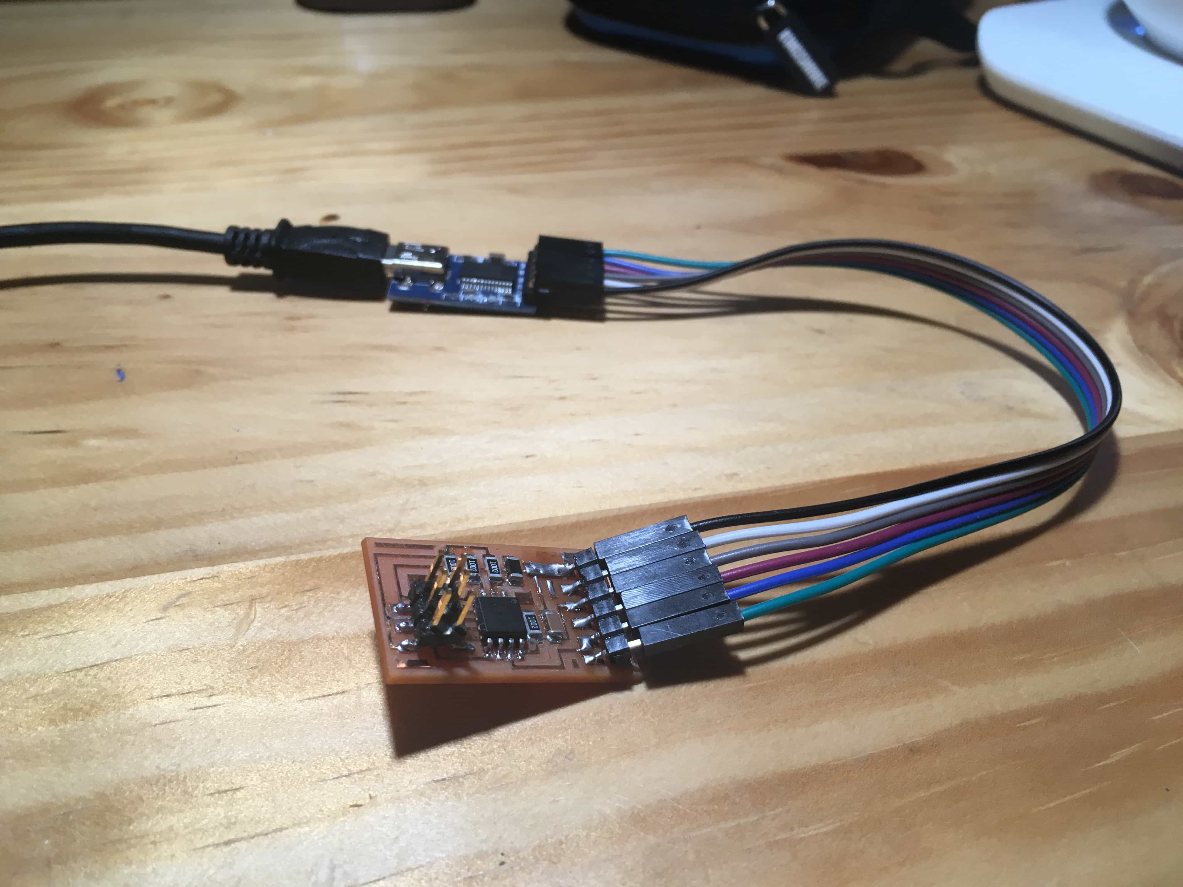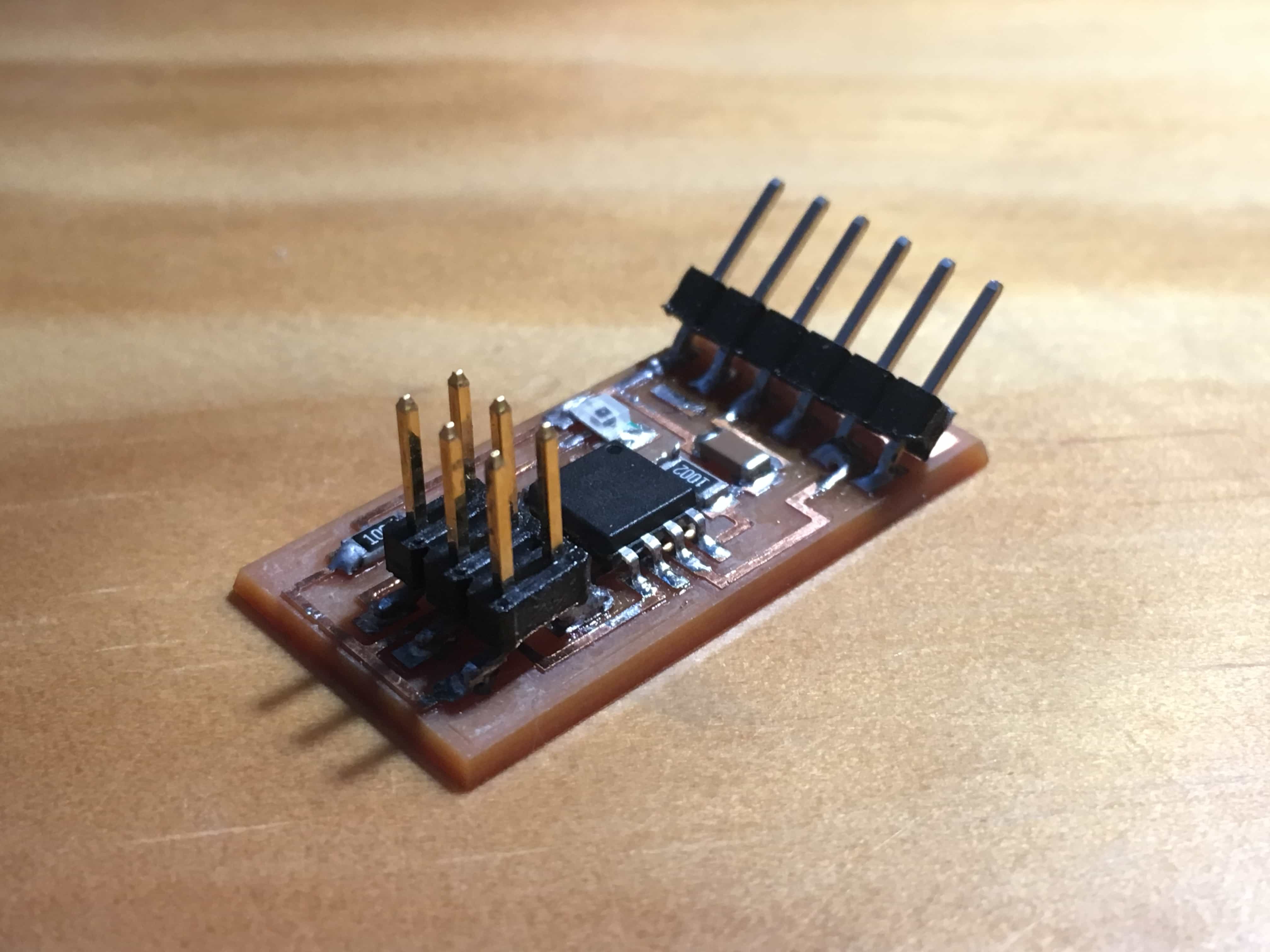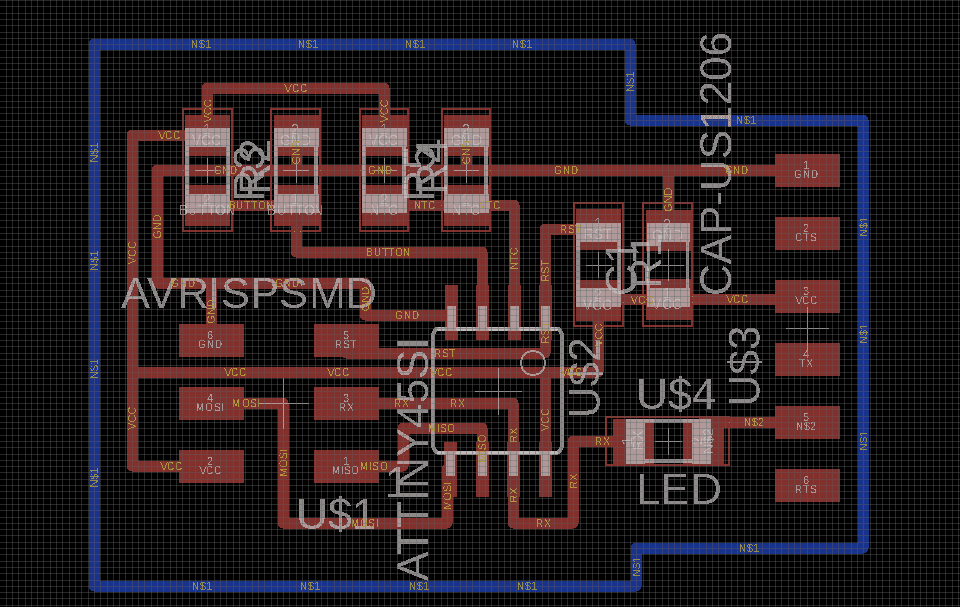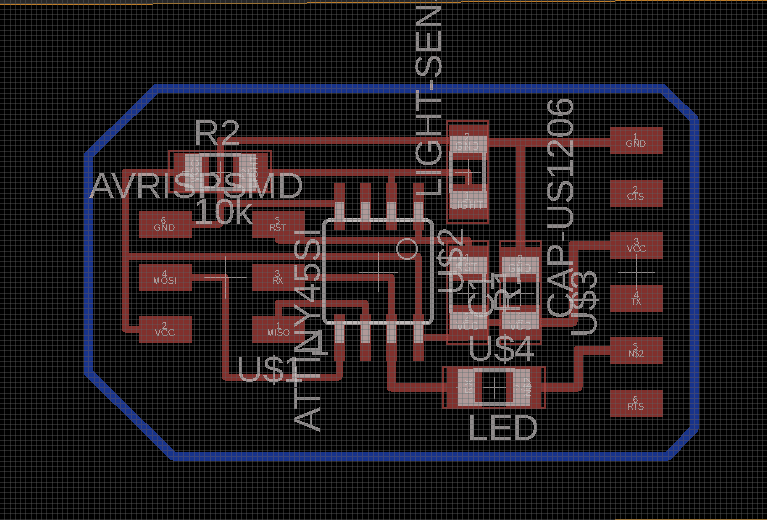 We have to design the board first. I wanted to use the light sensor and temperature sensor (NTC), so I viewed Neil's Design and replicate the skematic of the circuit with EAGLE. After that, I route the board and milled it.