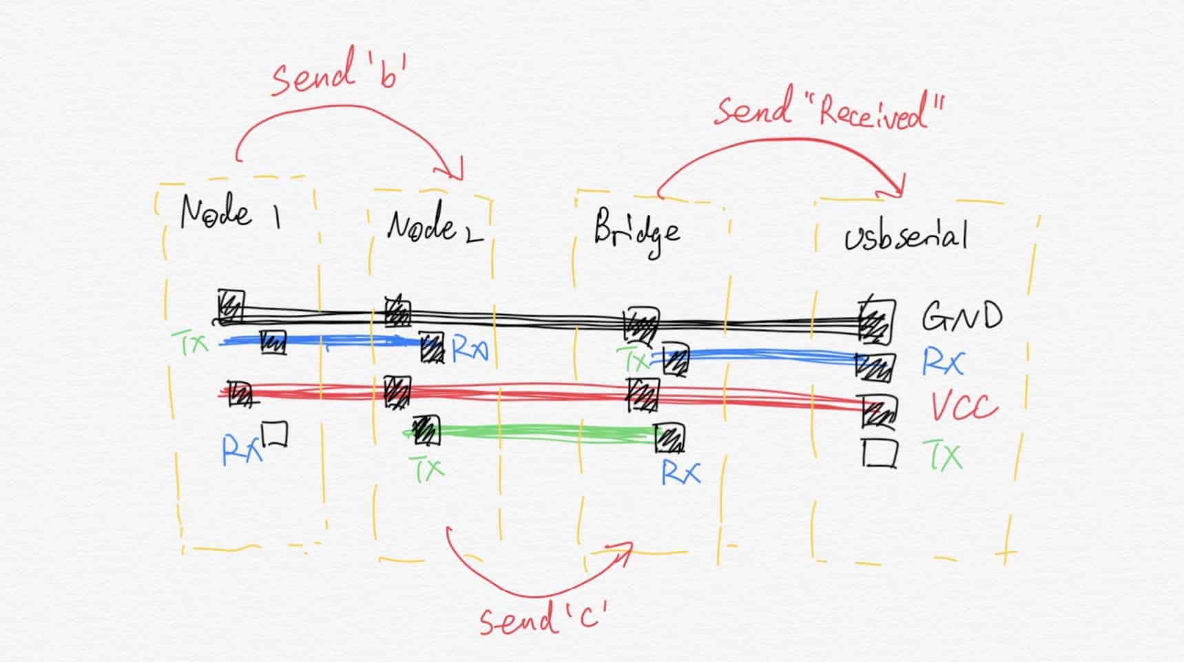 First, I draw a draft of the connection of ports on the three boards and usb serial. In order not to make the signal from node 1 and node 2 interfere with the output signal of the bridge, I cut off the RX-TX wire and made some altered the TX/RX pins of board node 2.