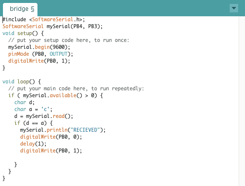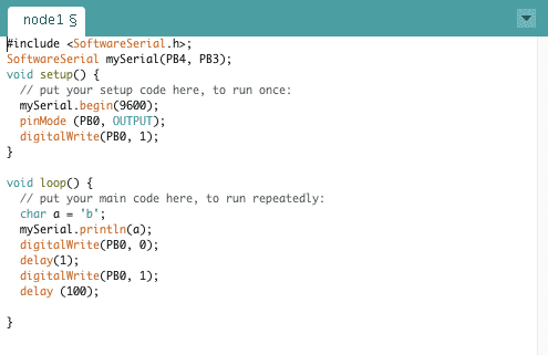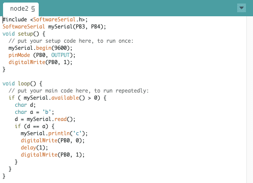 2. Another problem was that at first the monitor only displays some uninterpretable marks. Soon I found out that my board was tring to read strings send from another board, which caused inconsistency on the types of variables. However, as I searched online, the code making Arduino to read a String is too large for Attiny 45's memory, so I had to make the previous node send only a char.
