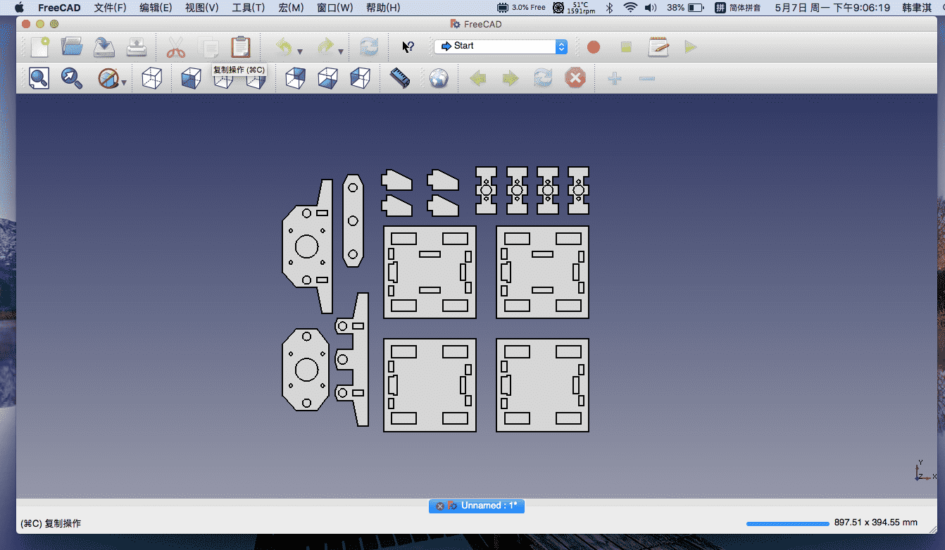 Then I designed the support parts and laser cutted them with 5mm acrylic materials. The four rectanular parts are the fixing platform of the joint between X and Y axis. The four parts on the left are the frame for the stepper motor and the 8mm metal sticks which help hold the machine's moving direction.
