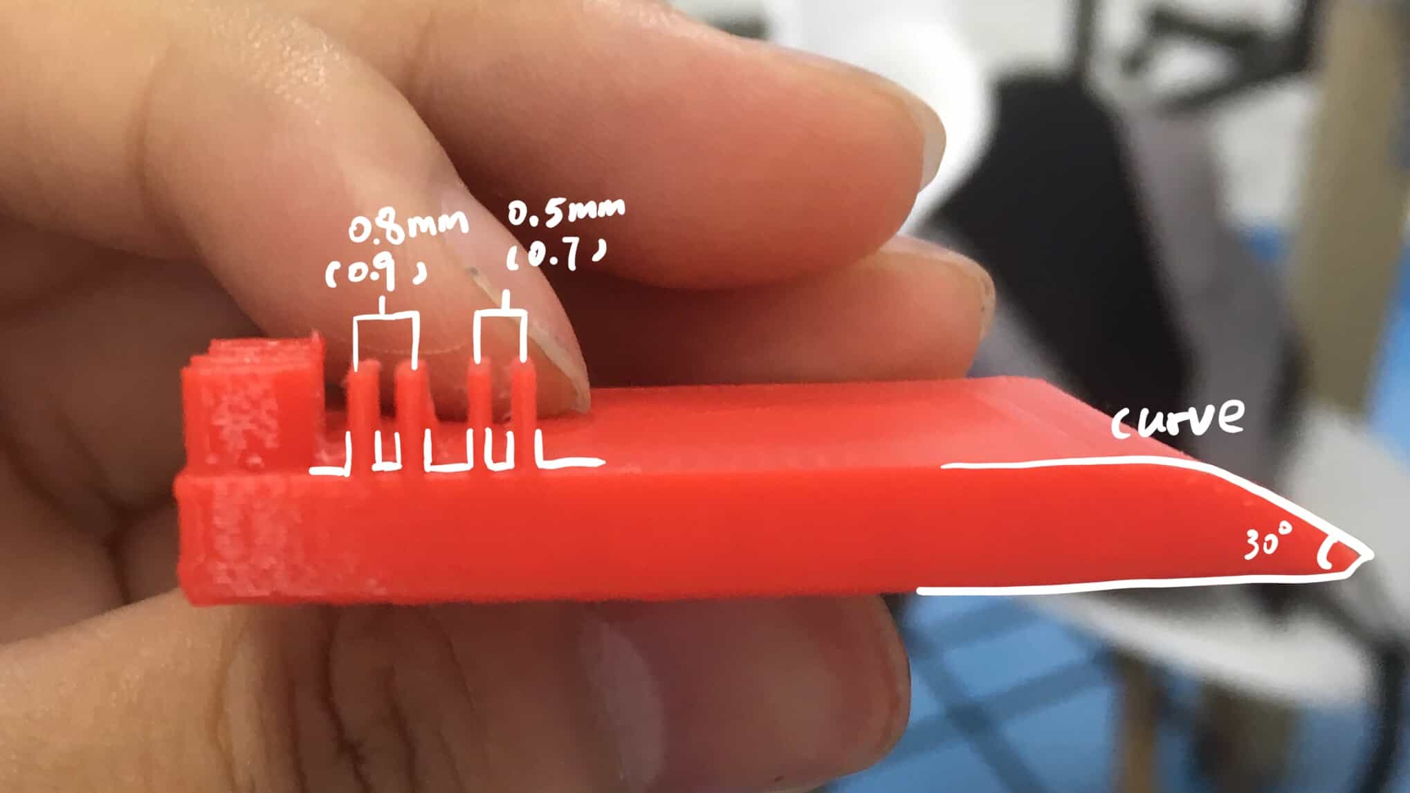 However, 0.3mm and 0.1 mm cannot be printed. And machine's short of accuracy reveals: the actual width of 0.8 mm block is 0.9 mm, and the actual width of 0.5 mm is 0.7 mm. The data is measured using vernier scale.