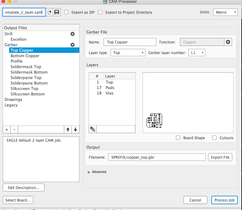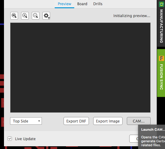 Click on MANUFACTURING and then click CAM. Select the layers you want to produce and output a gerber file, which can be used later to generate gcodes, the route of CNC machines.