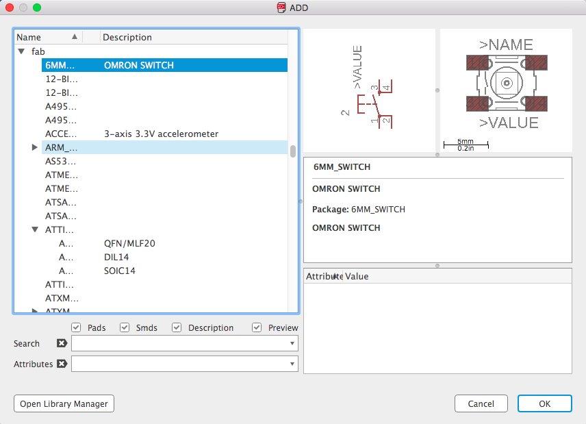 Before darwing a schematic, we have to check our library. Eagle is installed already with librarys, but now we have to download basic libraries of Sparkfun in the library manager. Then, for some special designed elements like ATtiny chips and ICSP bus solder pads, which are not included in Sparksfun Libraries, we have to download a fab.lbr from git hub in order to complete our design tasks for fabacademy.