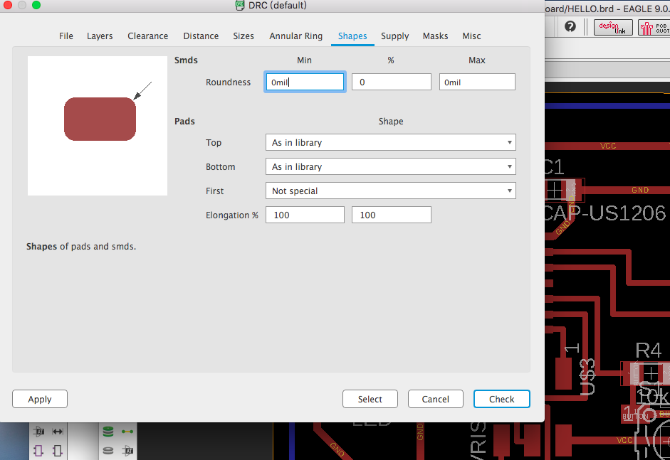 This is the window of DRC. We can change the layers, shapes of pads, other signs, etc, in this page. After confirming the design rules, click "Check".