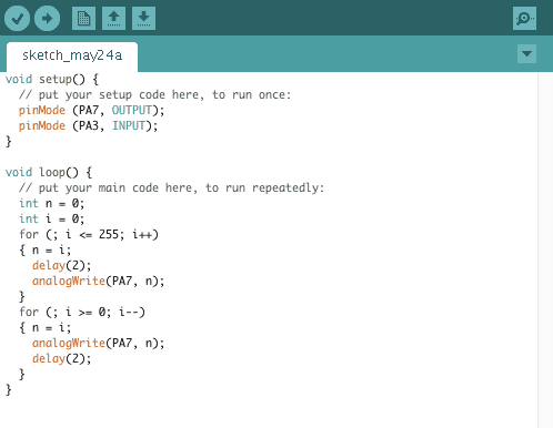 As I know, Pins A have ADC functions, which means you can use those pins to read or send analog signals. For my program, I am connecting the LED to PA7 so that I can change the brightness of LED with analog output.