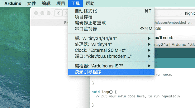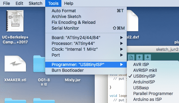 Third, choose "usbtiny" as the programmer in Arduino, and do not choose port. Then burn the bootloader or upload your code.