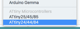 Choose ATtiny 44 board, External 20 MHZ clock (we choose this because we have already designed an external crystal on the board), usb port, and Arduino as ISP.