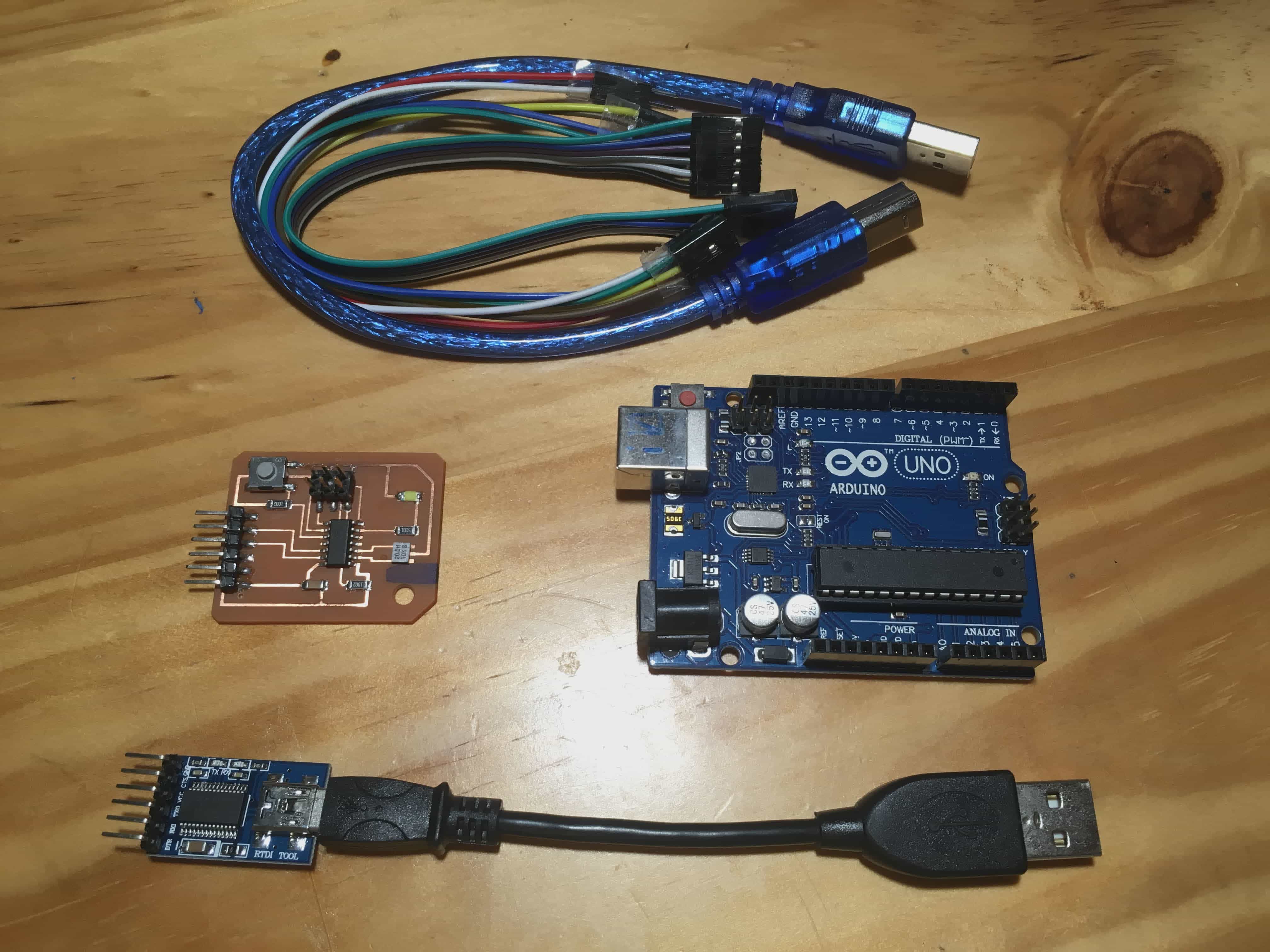 Here are what we get: hello board, arduino uno as isp, ftdi serial, and some wires.