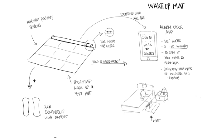 The goal is to encourage people to start an exercise routine. You have to make between 5 and 10 minutes of exercise and each day you will have different objectives. My product will be like an exercise mat wich connects with an App. I'm planning to use motion sensors and also design dumbbells that will connect to the mat to help tha rutine.