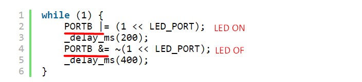 1.Neil´s code was written in C language, I don´t have experience with it so I needed information on how to program LEDs with C language. I found that in a tutorial that the code used to Blink a LED was: