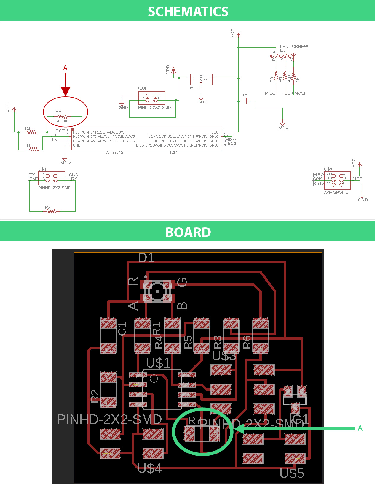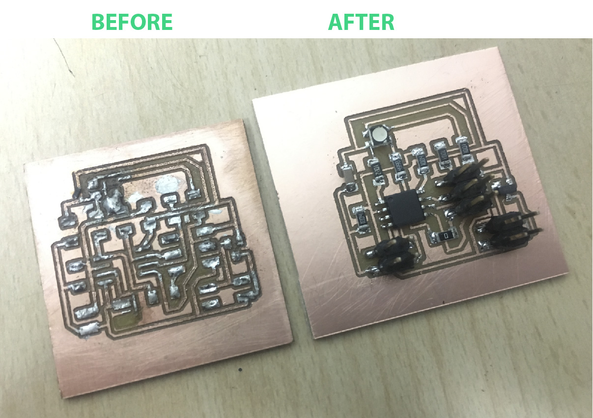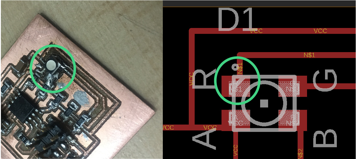The milling traces had rough edges and the general aspect wasn't what I expected but I went ahead with the soldering part and I made as mess. My biggest mistake was that I soldered the RGD LED in a wrong position connecting the Red pin (PIN 1-package marking) with the Green pin's route. I used the heat gun to remove the RGB Led and due the overheat the copper trace broke and my "great" idea was to add more tin and make a mountain of it. As you can see everything looks awful and My OCD spirit was about crash. So I ended up by doing a new board and soldered everything in the right way again.
