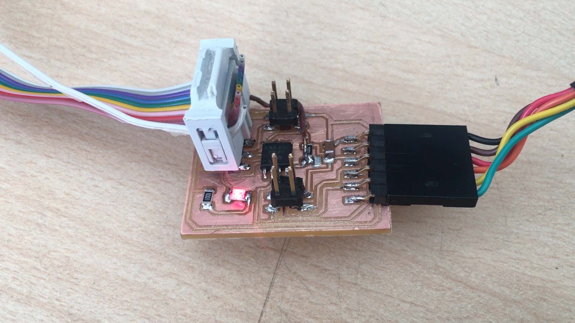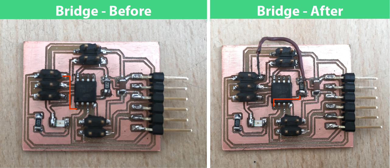 With the bridge board I had some troubles but I noticed them when I wanted to program it. My mistake was: I' didn't connect one pin of the PINHD-2x3-SMD to the Attiny45. In order to fix it I used a wire to connect them. After that it worked.