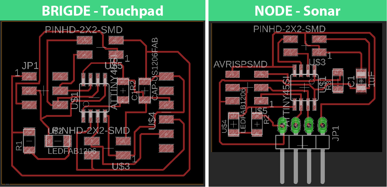 I'm using RS232, it was necesary to have two different boards, one is the Brigde and the other the Node. For the first one I redesing Neil's and I added the components from the Touchpad I made and for the second one I mixed up Neil's with the Sonar board suggested in Input devices.