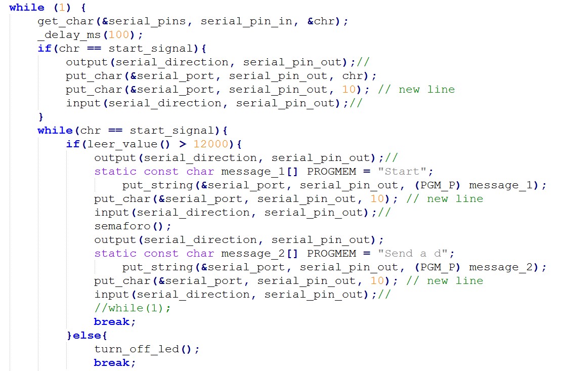 After that I needed to mix my code from the output's assignment and Neil's brigde code. I could turn on the LED but I couldn't turn it dowm. What I found out: millis() function was interfering with PUT_CHAR (function used to send characters), it was interrupting PUT_CHAR too often.