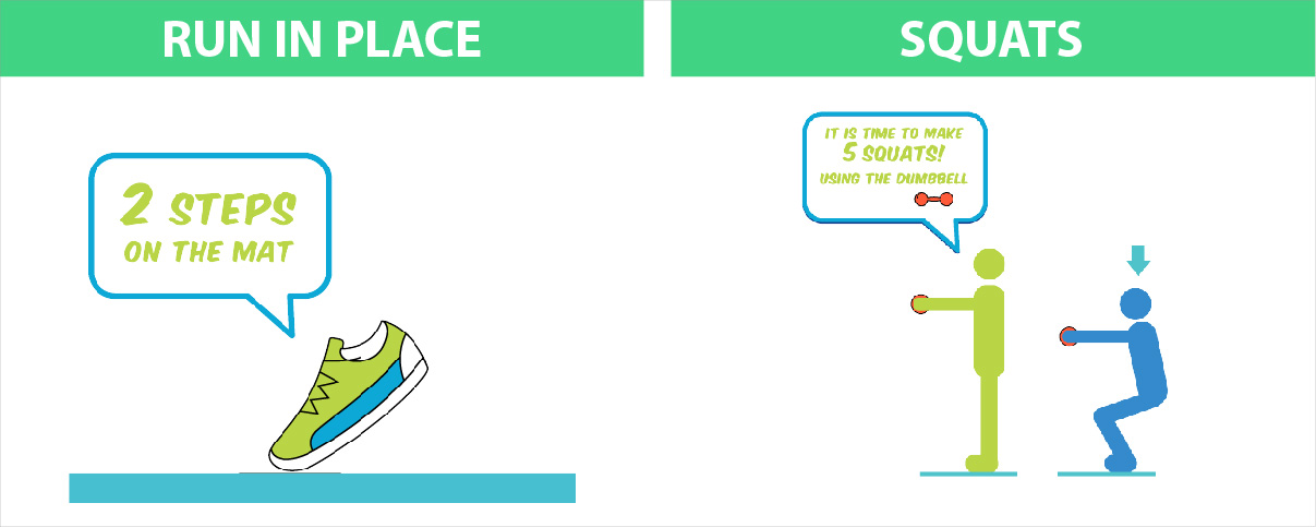 4. The DUMBBELL receives the "d" and starts counting squats. After five squats it sends "Good Job!".