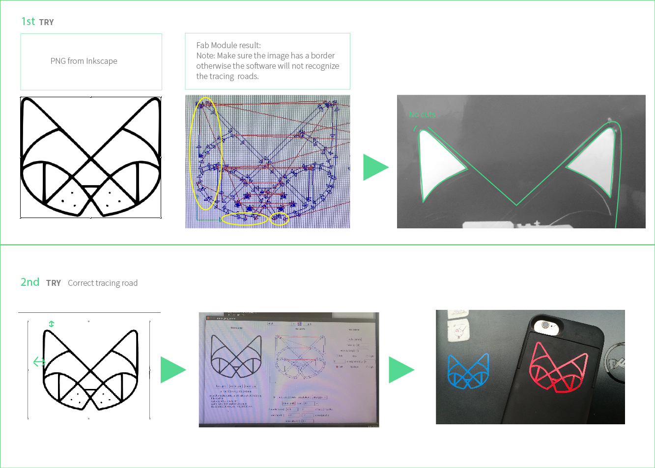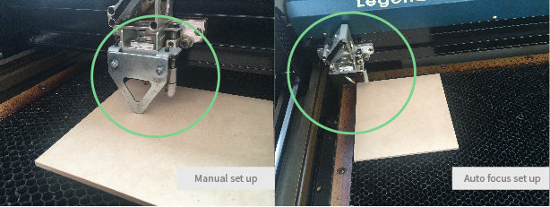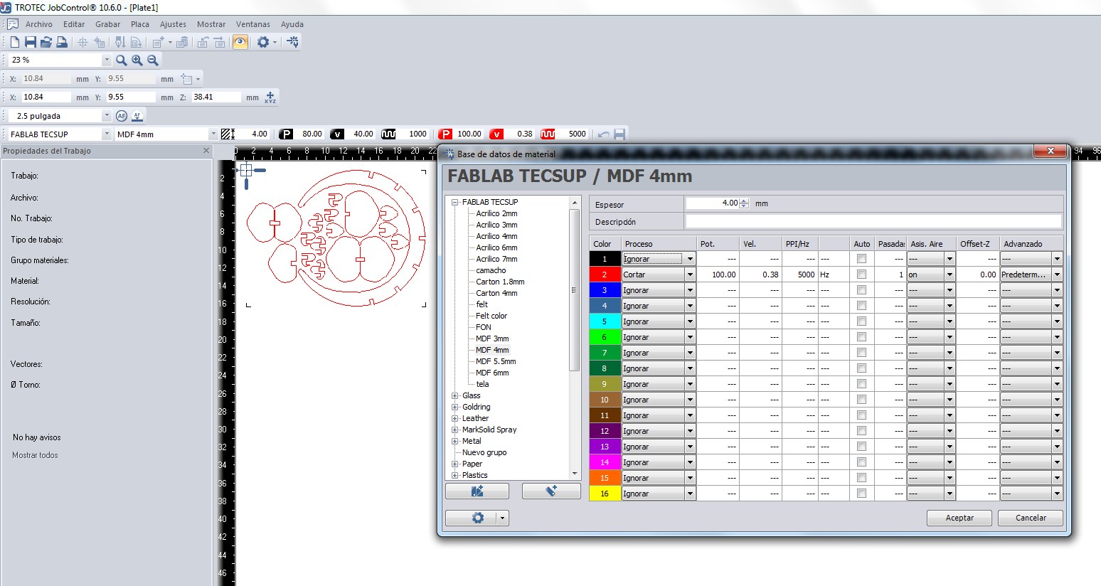 To define the cut & raster parameters we use Autocad. We make this first attempt with 4mm MDF the folling settings (speed 22% / power 100% / Frequency 5000) but as you can see, the laser burnt the borders.