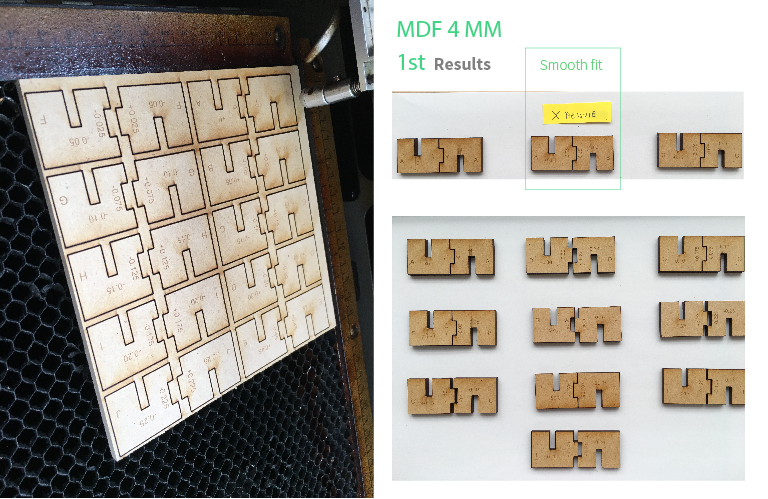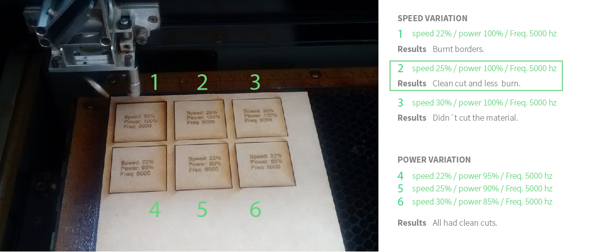 This week we needed to characterize our lasercutter and make test by varying cutting settings and dimensions.