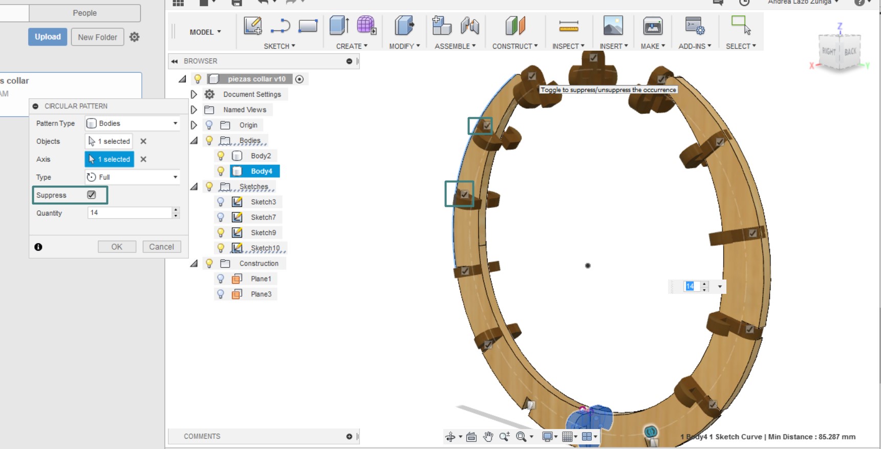 My experience with Fusion 360 was in between love and hate, it took time to make it parametric but after serveral failures I managed it. Here the main steps I took to make the necklace.