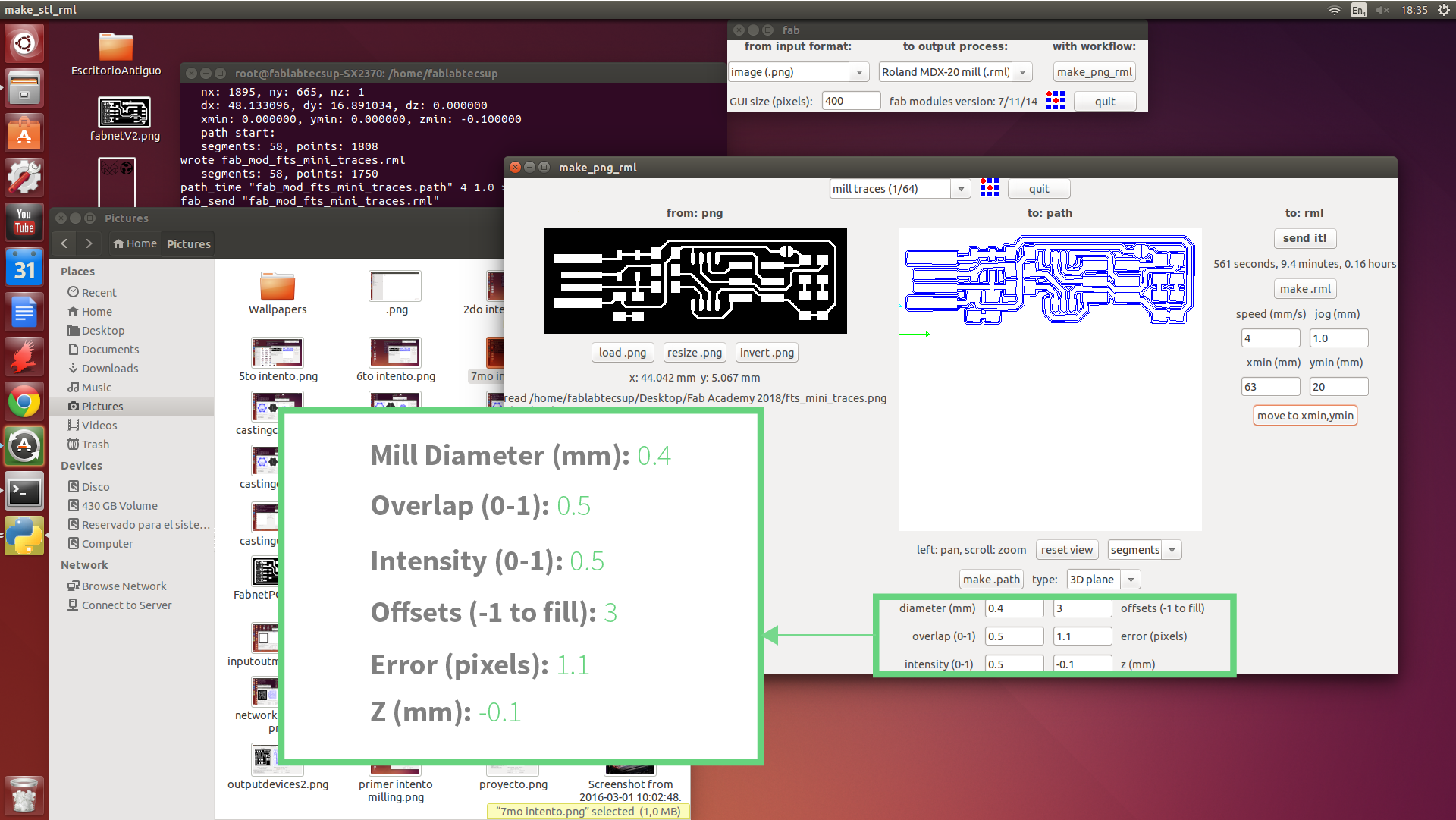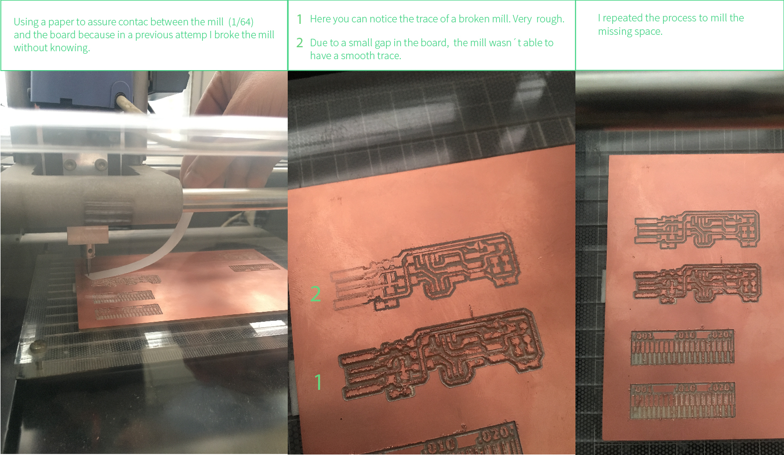 a. I upload the board trace to the Fab Module and the set up the milling path. b.Mill trace selection = 1/64.c. Set up used: