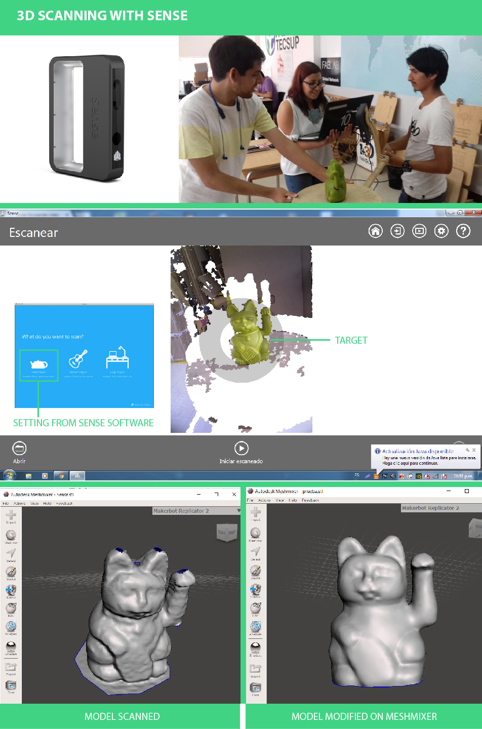 To be able to work with the Sense Scan, I used a "holder prototype" localy built that help us to rotate the scanner around the object. Due to the prototype, it was imposible to do it alone because I hab to hold the computer during the scang process. Future adjustment: Modify holder design.