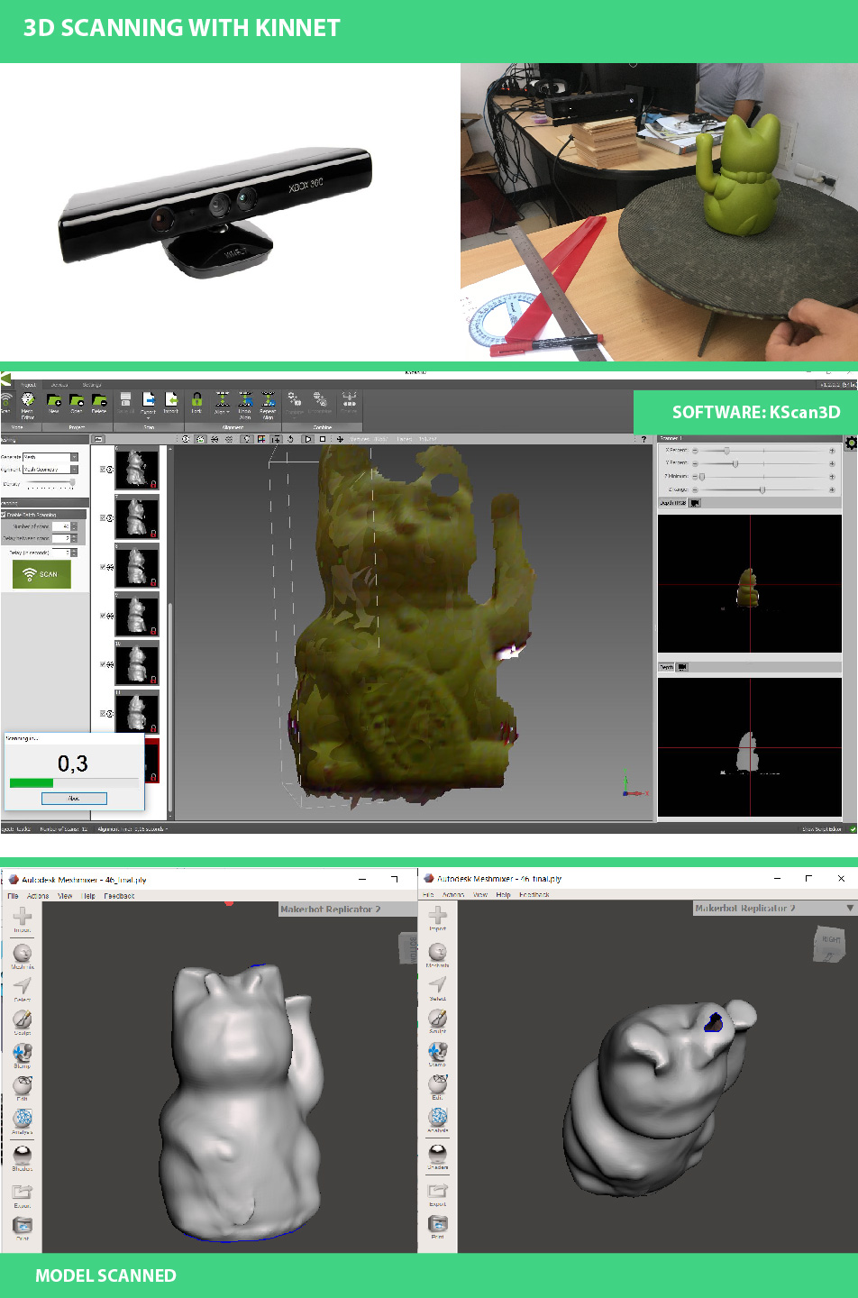As you can notice on the photos below ↓ the resulting model was less damage but with less details. The most important difference is that with this type of scannig I didn't rotate the SCANNER, instead of it I rotated the object and I used a metal rotating support.I could do it without any help and using Kinnet's Software:KScan3D. You can download it