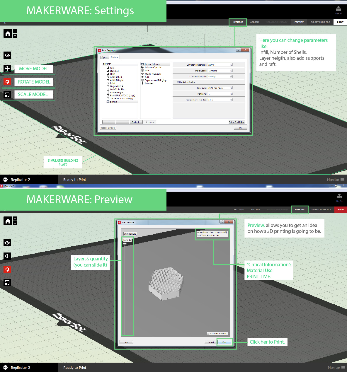 MakerWare is really easy to understand and to work with, here we let you the most important information: Settings & Preview.