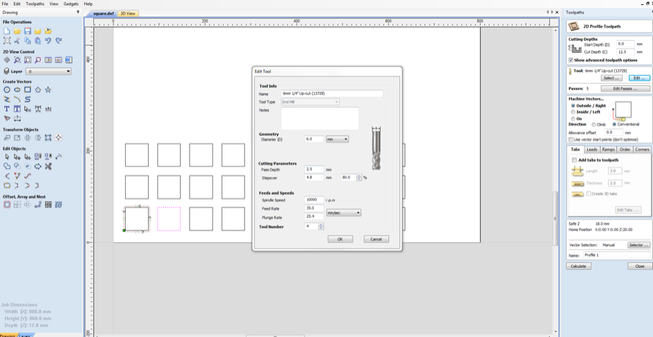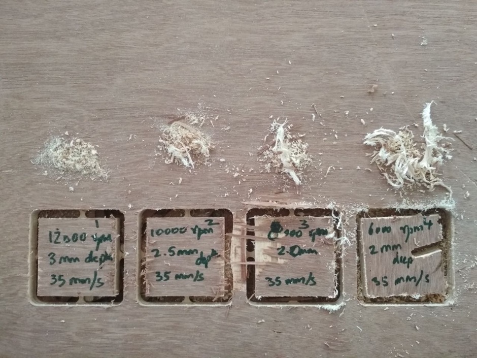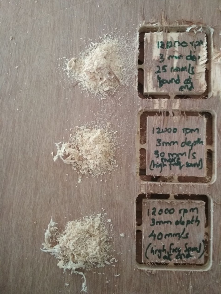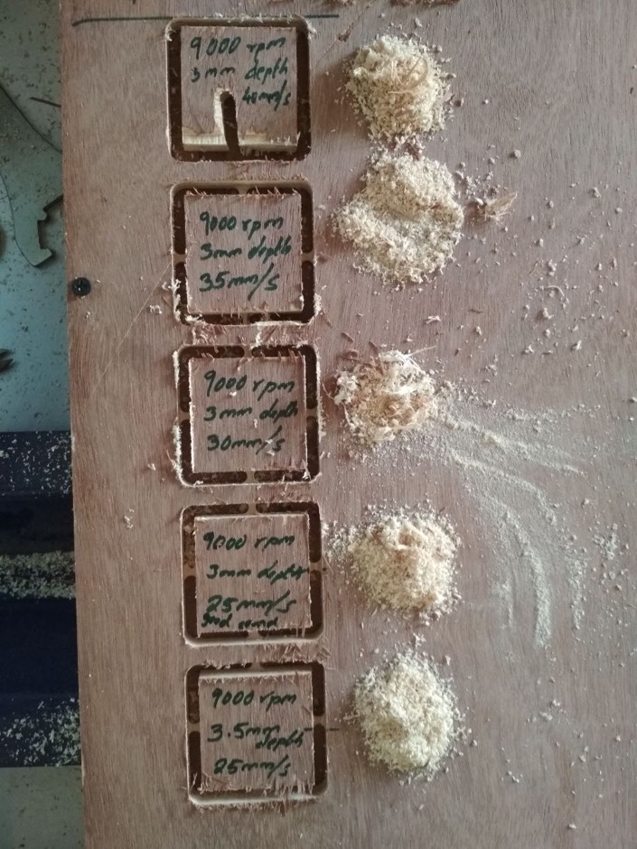 For testing this we cut small square shapes at varying spindle speed,feed rate and depth.Shapes with similar rpm were