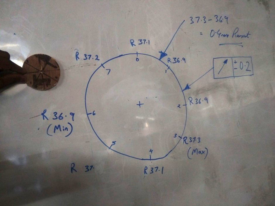 ForRunout a circle was cut and the measurements were taken at different points.Runout happens due to the inaccuracy of the