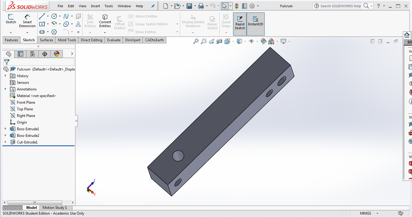 The solenoid we purchased online arrived to our dissapointment. The device was not having sufficient force to pierce a paper. Me, Abhilash and Aby tried alternate ways to make it work. I tried by using a lever by making it to act over the lever pivoted on a fulcrum. The below part was designed for the same.