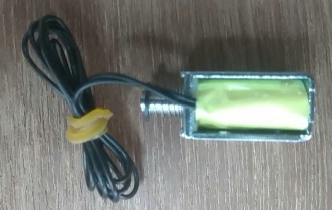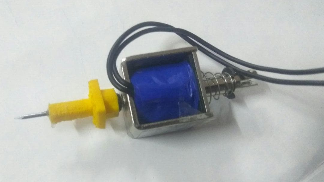 However, after i tested the arrangement with left over wooden pieces, the working was not satisfactory and we searched for other methods. Me and Aby tried to make a servo motor to act as the end effector and succeeded by attaching a needle to the end. But finally we used the much bigger solenoid which was purchased over the internet, after we realised the initial one wont suit our requirement. The below image shows the final end effector solenoid with a needle designed by vishnu with the piercing needle.
