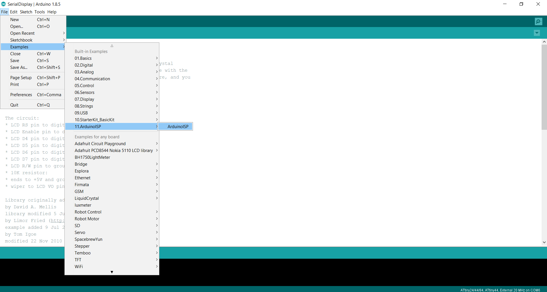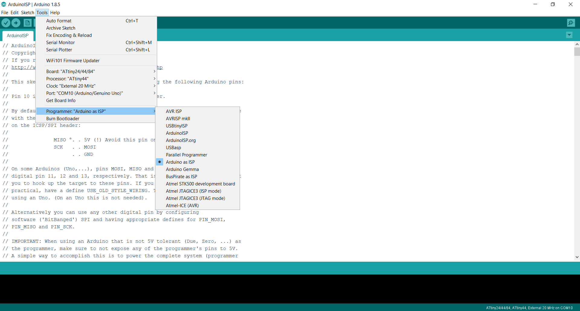 1. First i made a programmable ISP of an Arduino UNO board according to the tools setup. Then I go and select the file-example-11.Arduino ISP