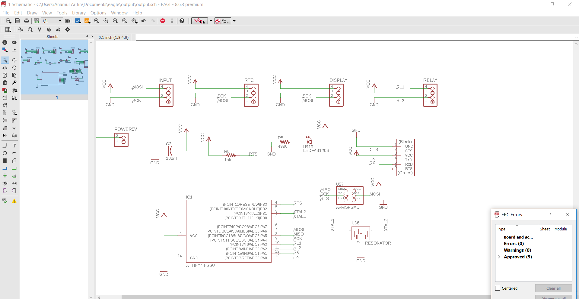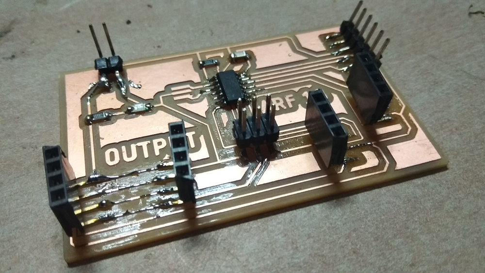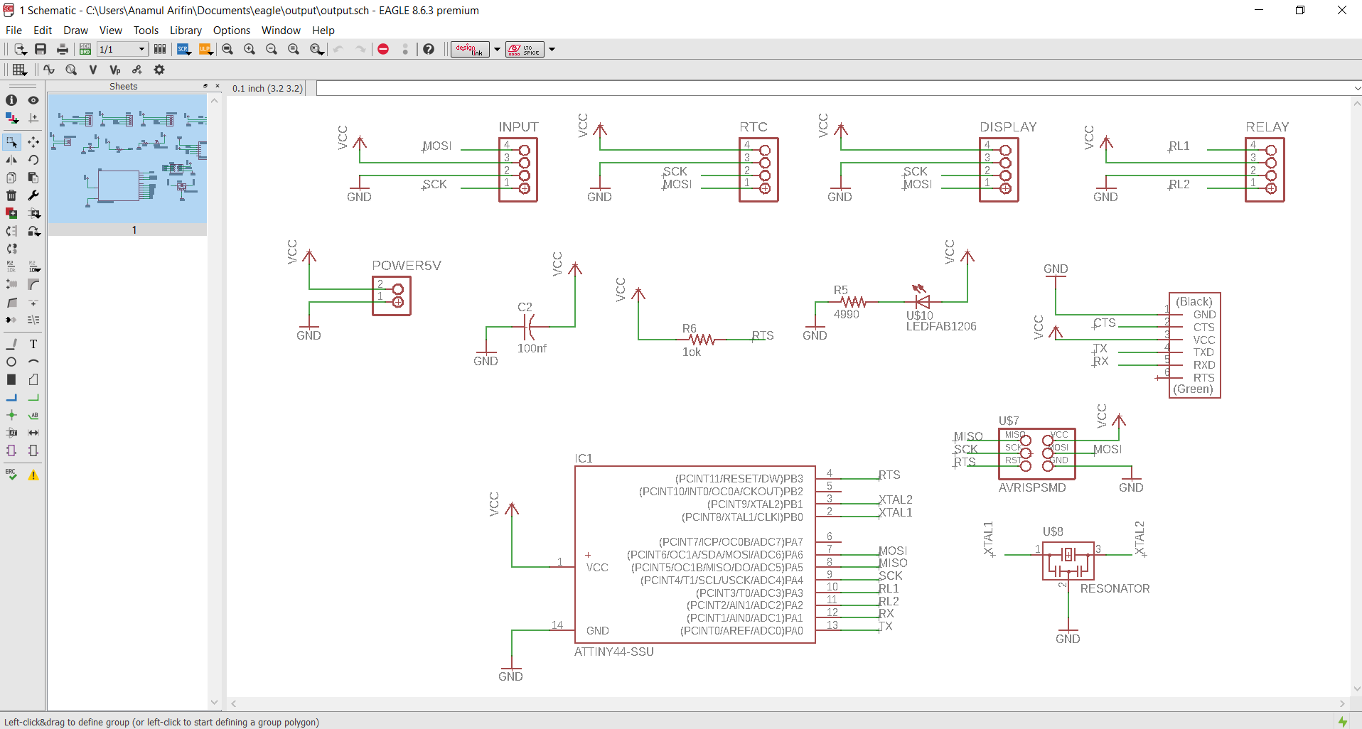 Description about OUTPUT board: When i was design this board, I had a plan to use of this board like LM35 temperature sensor data come from input board to output board via I2C protocol, second i want to use RTC by I2C and OLED also want to use I2C protocol. then singal pass through vai one port to Relays board. For serial communication I also keep FTDI pin. In this board all programme are control by ATtiny44A.