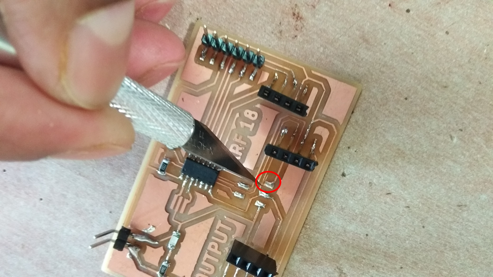 14. After soldering I faced one error in my board that is the VCC pad are attached with MOSI traces line, then I used hot air gun for remove the ISP pin header and used exacto knife for making a gap between the pad and trace.