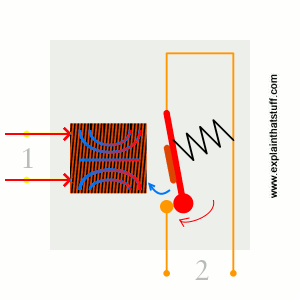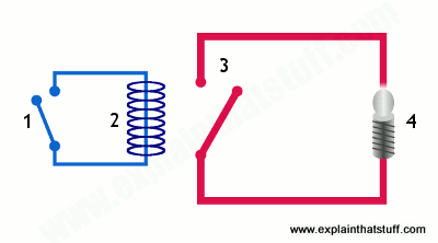 A relay is an electromagnetic switch operated by a relatively small electric current that can turn on or off a much larger electric current. The heart of a relay is an electromagnet (a coil of wire that becomes a temporary magnet when electricity flows through it). You can think of a relay as a kind of electric lever: switch it on with a tiny current and it switches on ("leverages") another appliance using a much bigger current. Why is that useful? As the name suggests, many sensors are incredibly sensitive pieces of electronic equipment and produce only small electric currents. But often we need them to drive bigger pieces of apparatus that use bigger currents. Relays bridge the gap, making it possible for small currents to activate larger ones. That means relays can work either as switches (turning things on and off) or as amplifiers (converting small currents into larger ones).